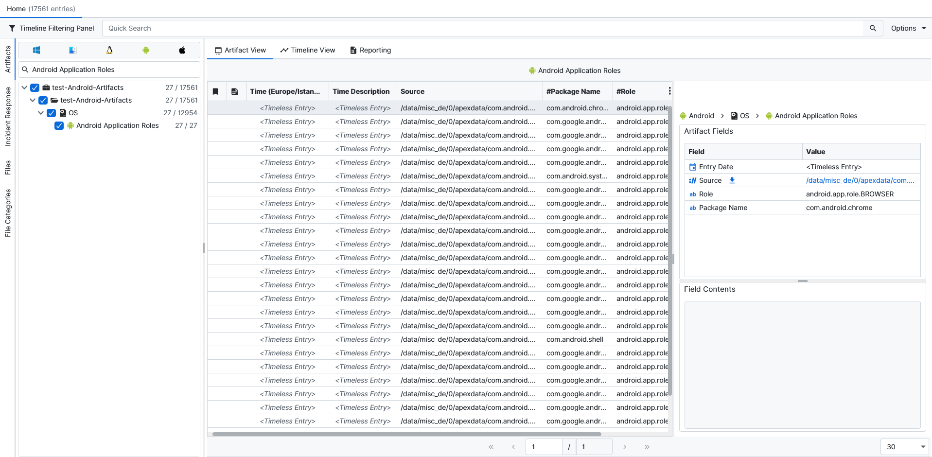 Once ArtiFast parsers plugins complete processing the artifact for analysis, it can be reviewed via “Artifact View” or “Timeline View,” with indexing, filtering, and searching capabilities. Below is a detailed description of Android Application Roles artifacts in ArtiFast.