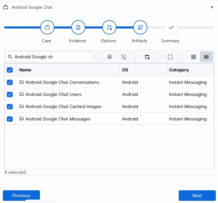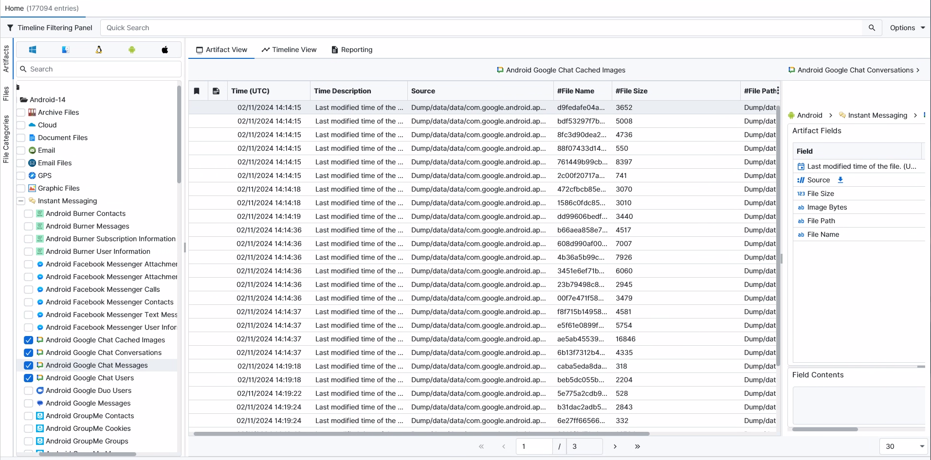 Once ArtiFast parsers plugins complete processing the artifact for analysis, it can be reviewed via “Artifact View” or “Timeline View,” with indexing, filtering, and searching capabilities. Below is a detailed description of Android Google Chat artifacts in ArtiFast.