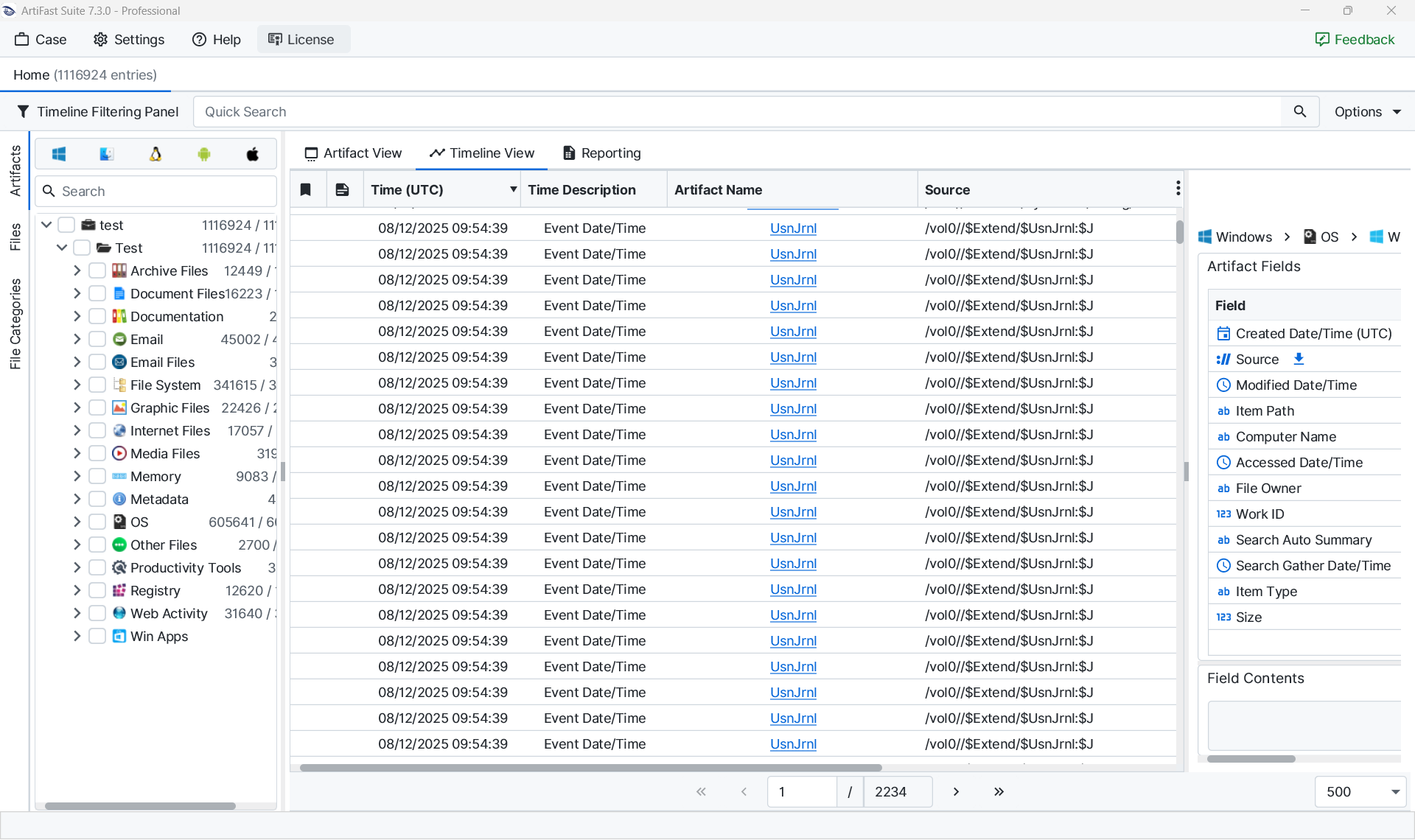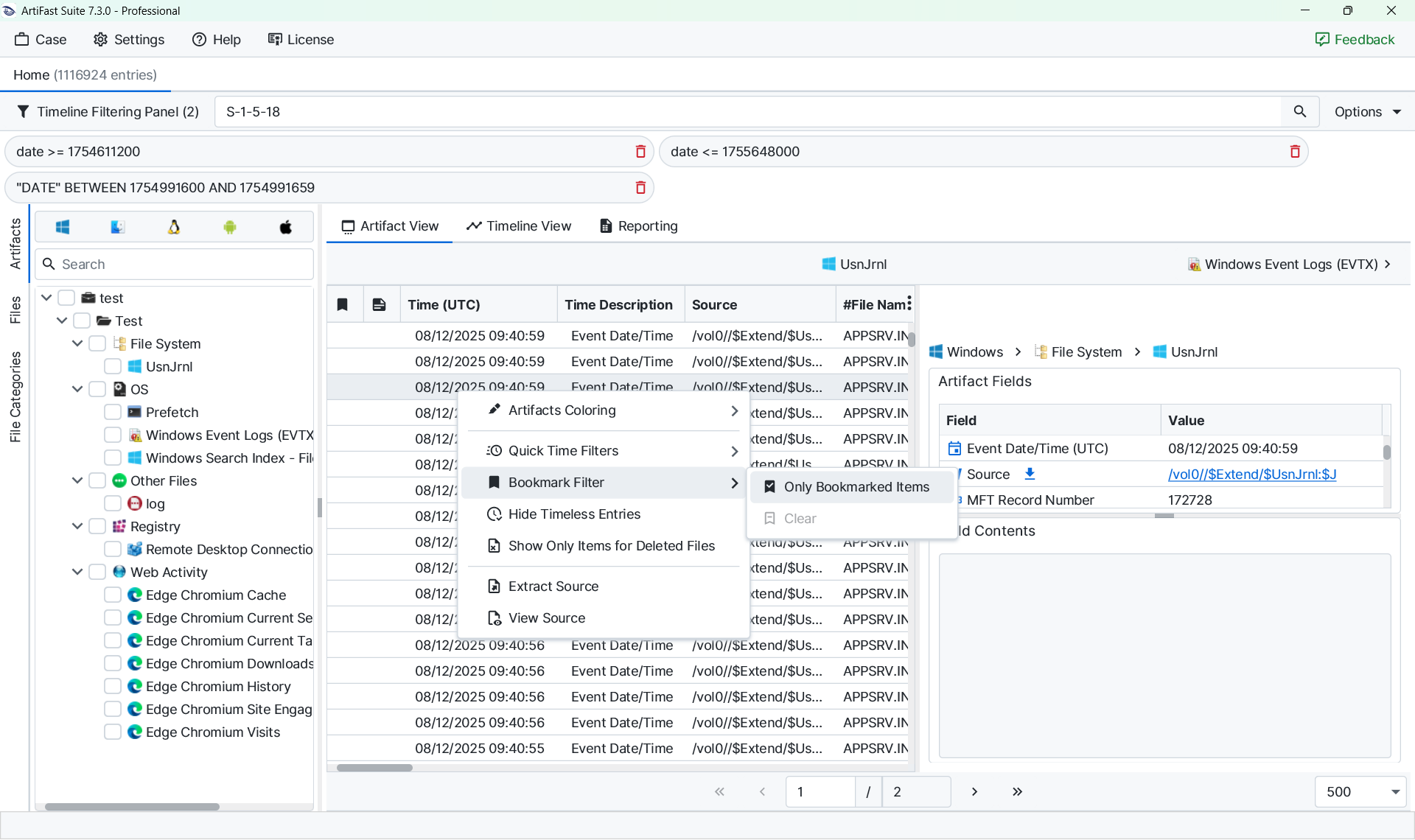 The Artifact View is the primary interface for detailed analysis. Reviewing activities artifact by artifact provides a structured workflow. The Timeline Filtering Panel is particularly valuable for narrowing results to specific timeframes, for example, the known incident window. This significantly improves focus during investigations.
