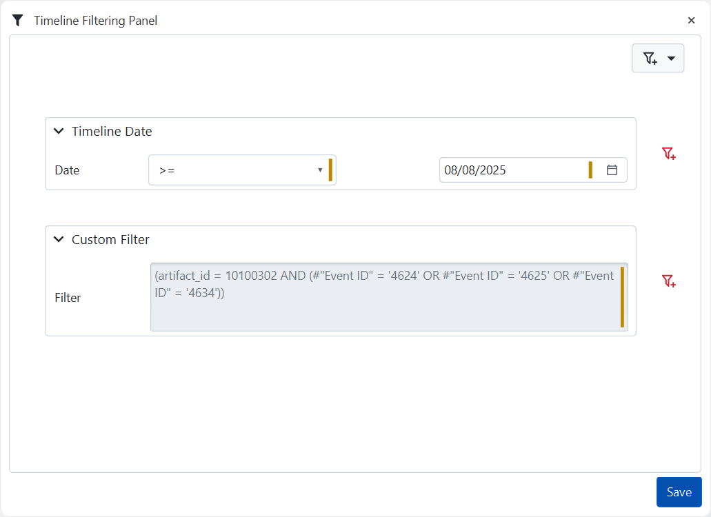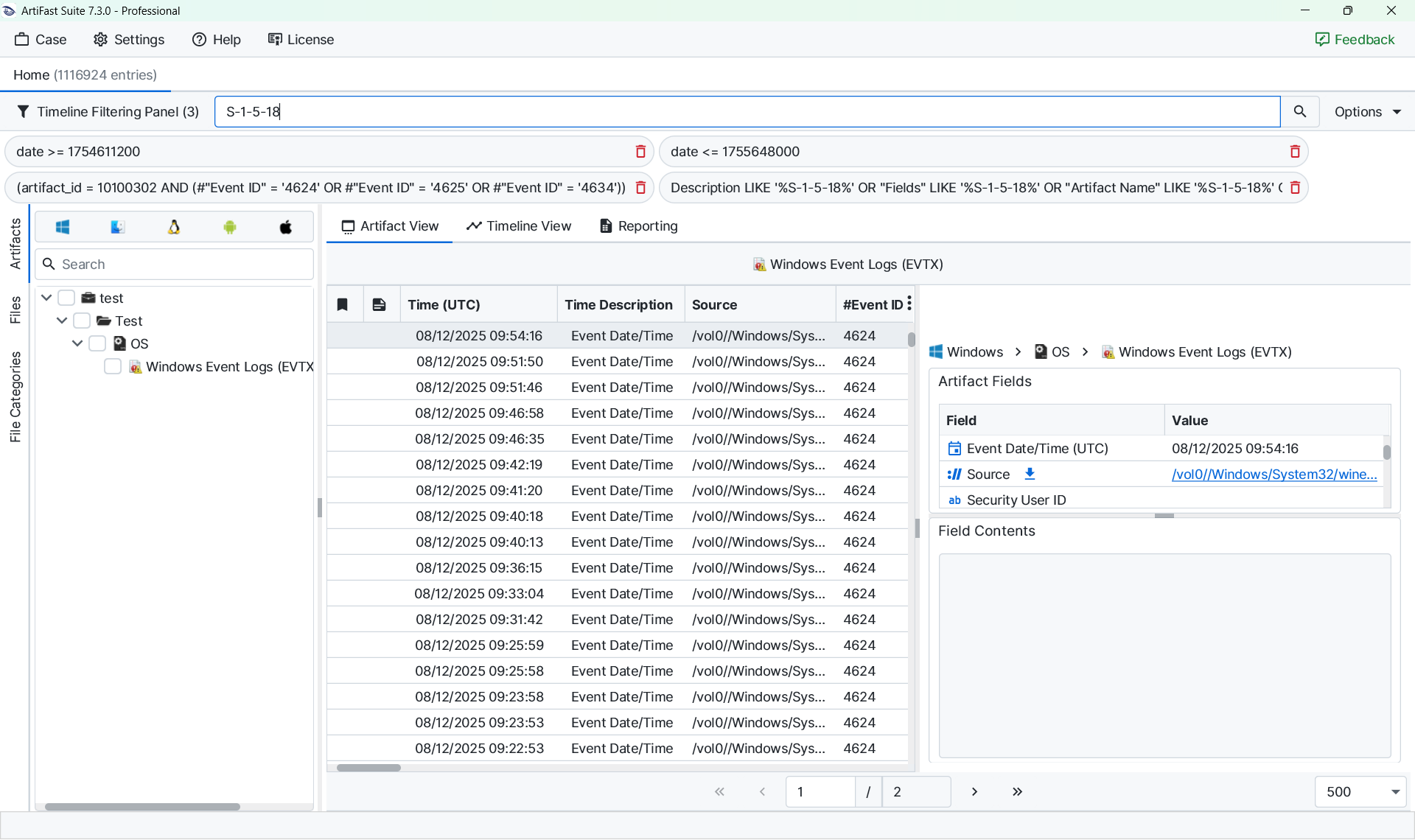 Windows event logs, however, frequently contain hundreds of thousands of entries, making manual review impractical. In these cases, custom filters are essential. Artifast Suite supports the creation of reusable filters tailored to attacker activities. For example, the following query isolates login activity: