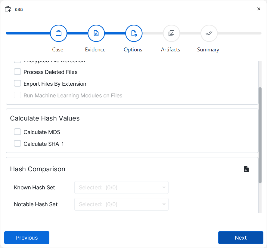 Once the image is loaded, the next step is file processing configuration. For triage images, options such as hash calculation, encrypted file detection, or file carving are typically unnecessary. These are more relevant for full forensic disk investigations. Because triage archives contain only the files and artifacts of interest, enabling these options adds processing time without delivering significant additional value.