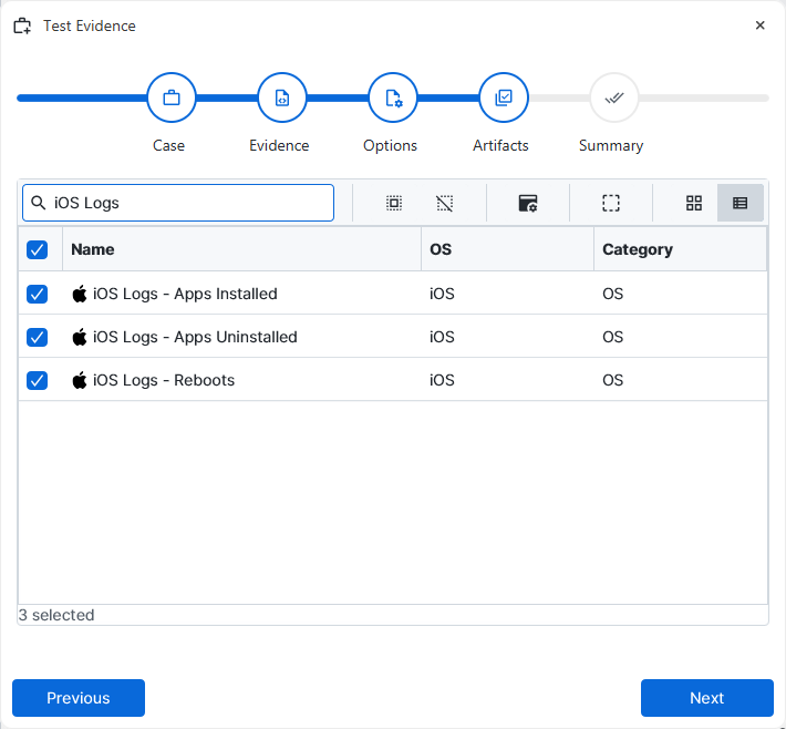 investigation, at the Artifact Selection phase, you can select iOS Logs
