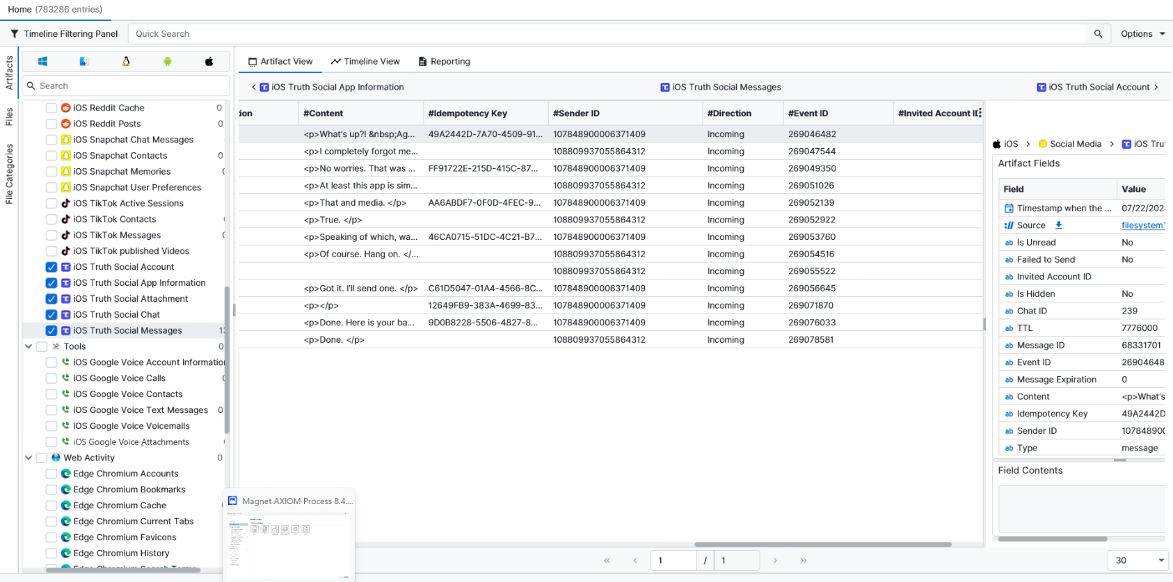 Once ArtiFast parser plugins complete processing the artifact for analysis, it can be reviewed via “Artifact View” or “Timeline View,” with indexing, filtering, and searching capabilities. Below is a detailed description of iOS Truth Social artifacts in ArtiFast.