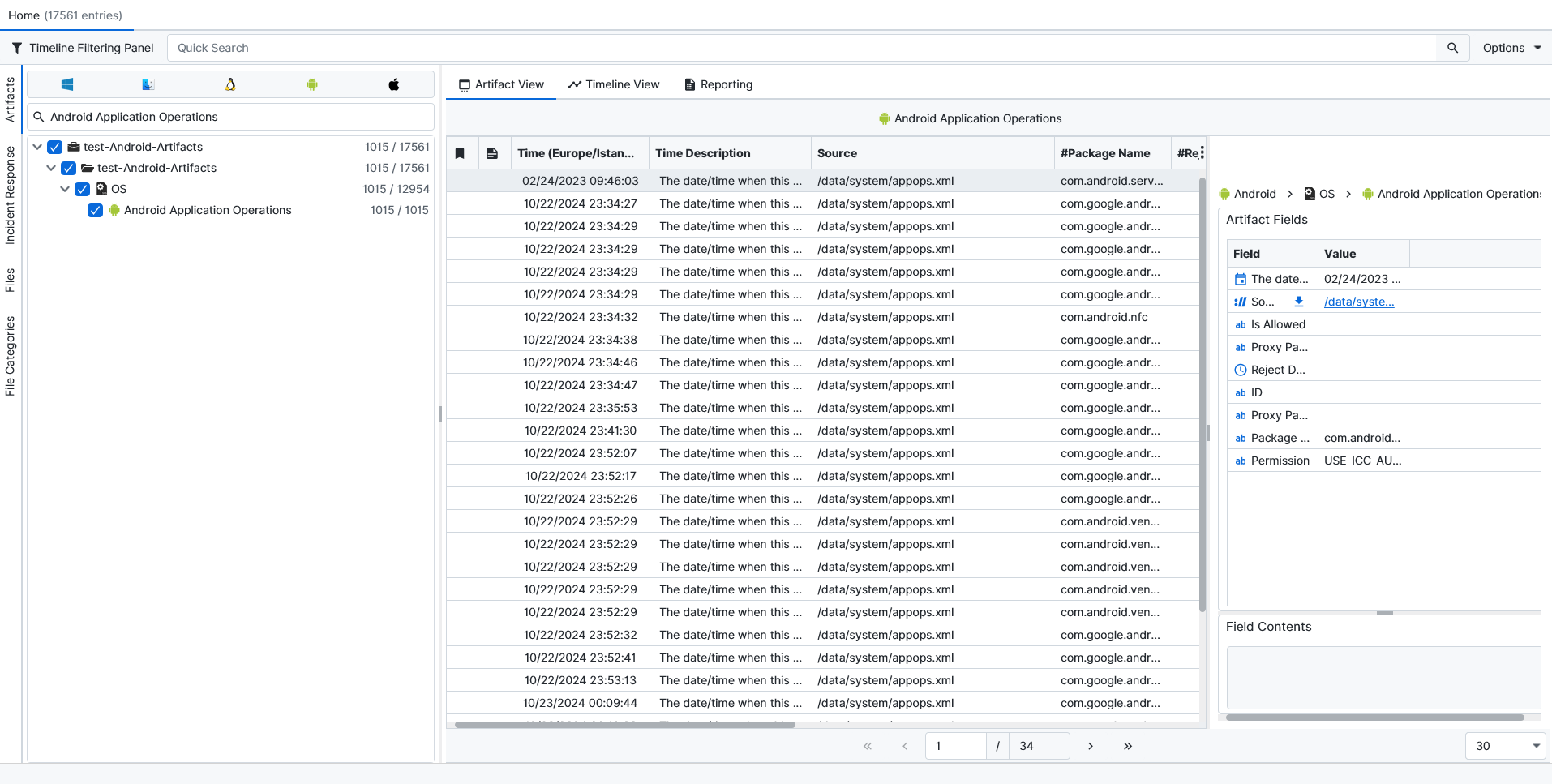 Once ArtiFast parsers plugins complete processing the artifact for analysis, it can be reviewed via “Artifact View” or “Timeline View,” with indexing, filtering, and searching capabilities. Below is a detailed description of Android Application Operations artifacts in ArtiFast.