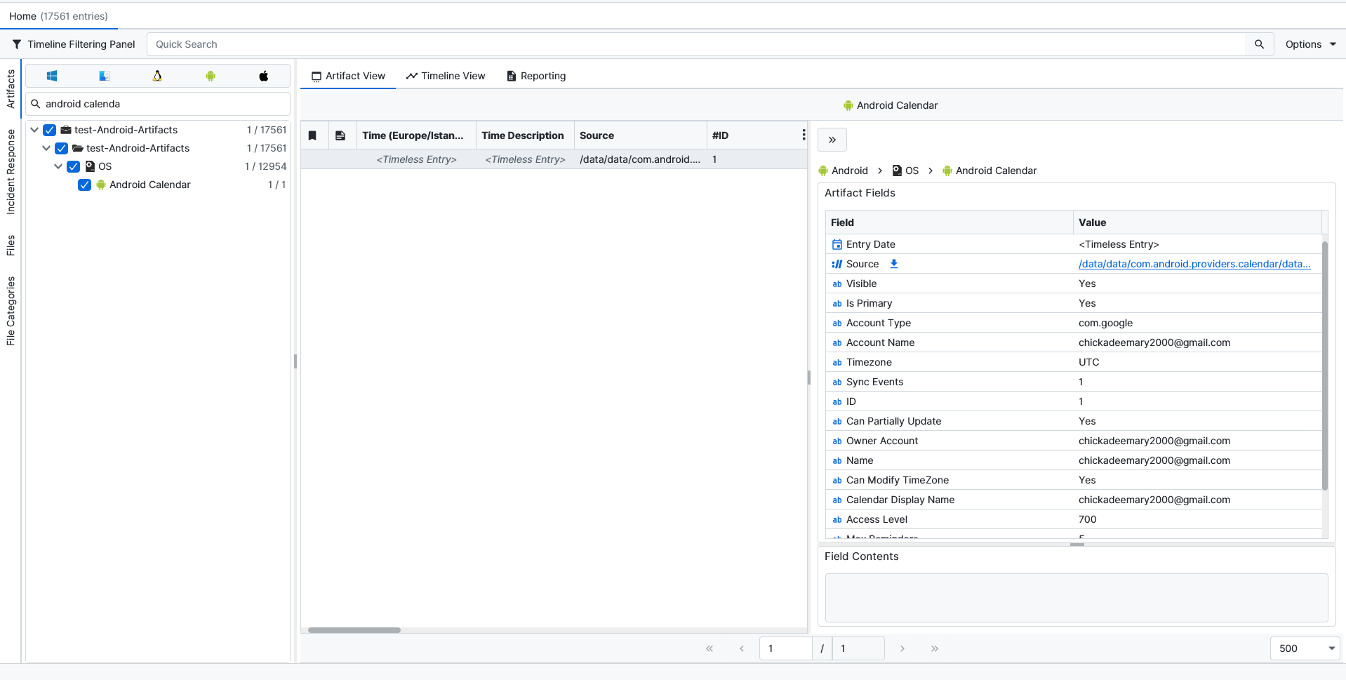 Once ArtiFast parsers plugins complete processing the artifact for analysis, it can be reviewed via “Artifact View” or “Timeline View,” with indexing, filtering, and searching capabilities. Below is a detailed description of Android Calendar artifacts in ArtiFast.