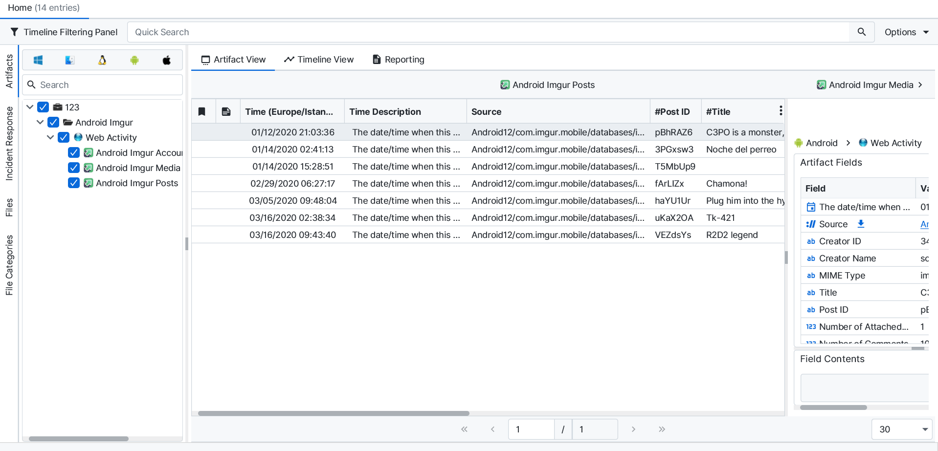 Once ArtiFast parsers plugins complete processing the artifact for analysis, it can be reviewed via “Artifact View” or “Timeline View,” with indexing, filtering, and searching capabilities. Below is a detailed description of Android Imgur artifacts in ArtiFast.