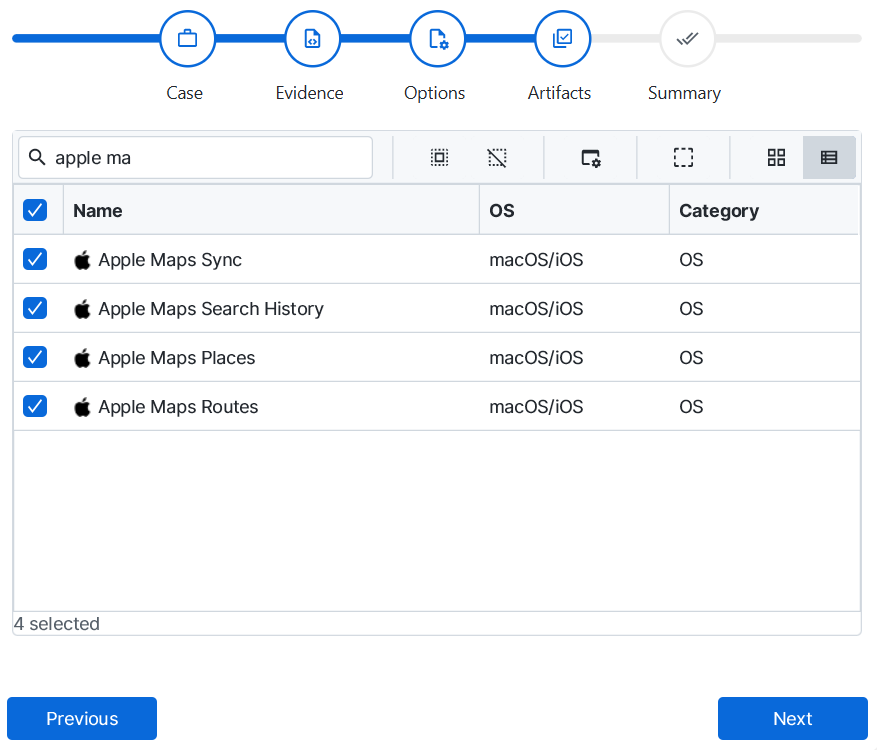 investigation, at the Artifact Selection phase, you can select Apple