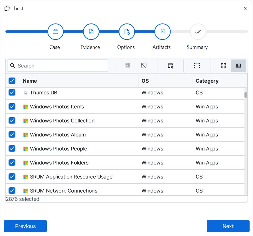 The following page allows for artifact selection. Artifast Suite supports selective artifact processing, but as artifact-to-file matching is extremely fast, selecting all available artifacts is generally the most efficient approach to ensure no relevant evidence is overlooked. Analysts who require a more focused dataset may select specific artifacts manually, depending on the case.