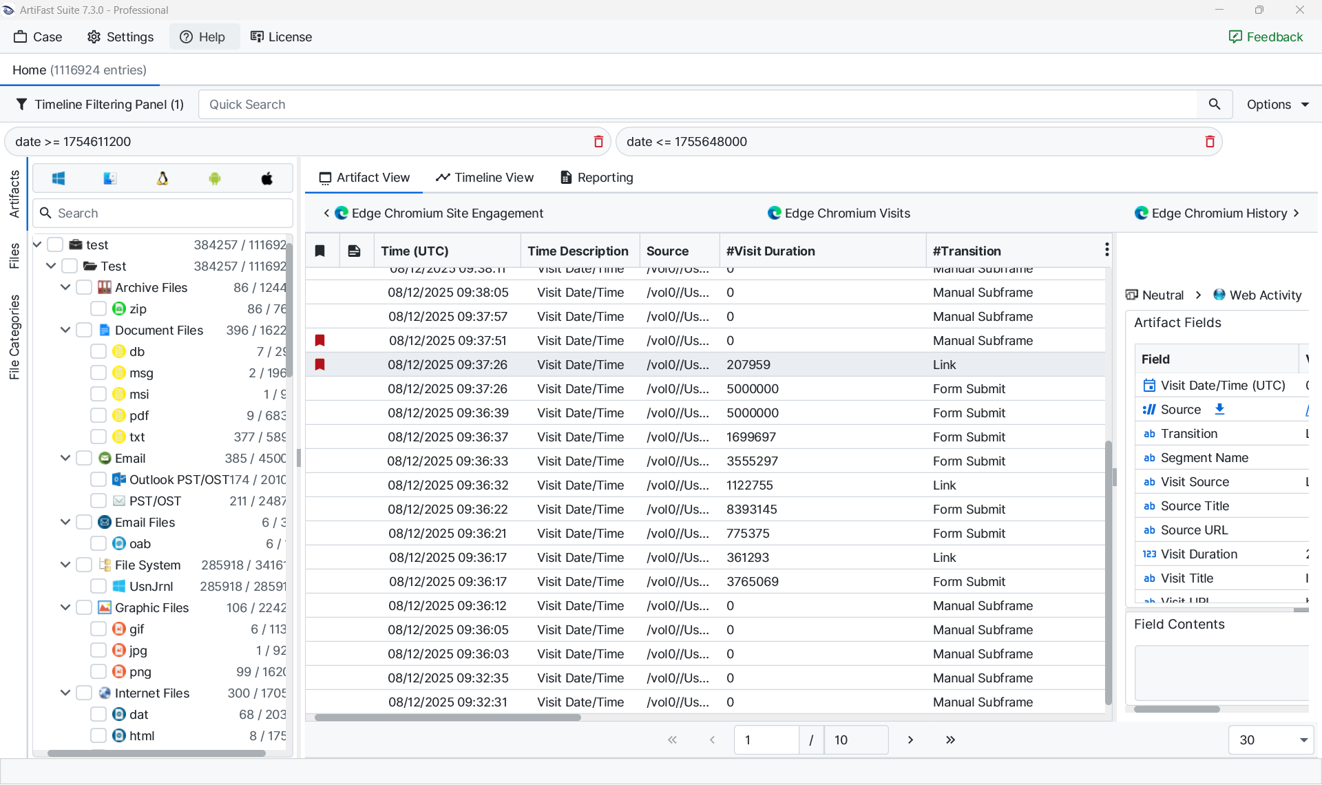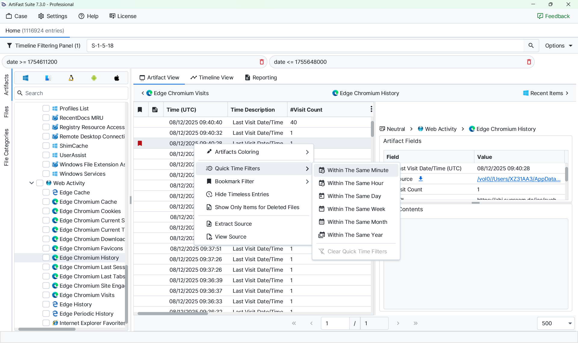 The Artifact View is the primary interface for detailed analysis. Reviewing activities artifact by artifact provides a structured workflow. The Timeline Filtering Panel is particularly valuable for narrowing results to specific timeframes, for example, the known incident window. This significantly improves focus during investigations.