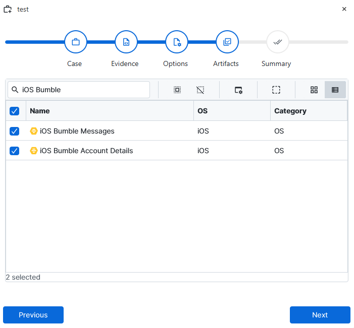 After you have created your case and added evidence for the investigation, at the Artifact Selection phase, you can select iOS Bumble artifact parser: