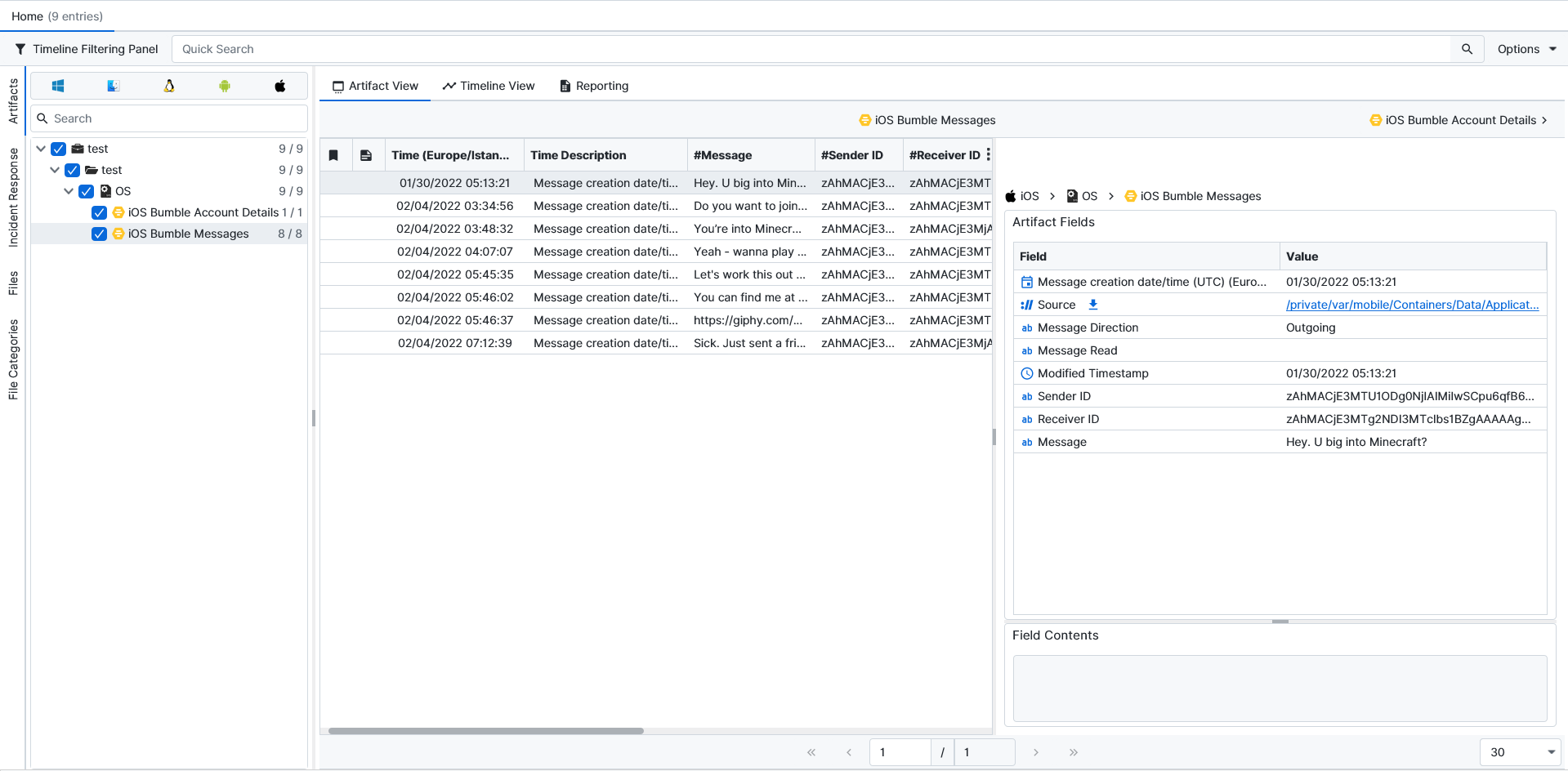 Once ArtiFast parsers plugins complete processing the artifact for analysis, it can be reviewed via “Artifact View” or “Timeline View,” with indexing, filtering, and searching capabilities. Below is a detailed description of iOS Bumble artifacts in ArtiFast.