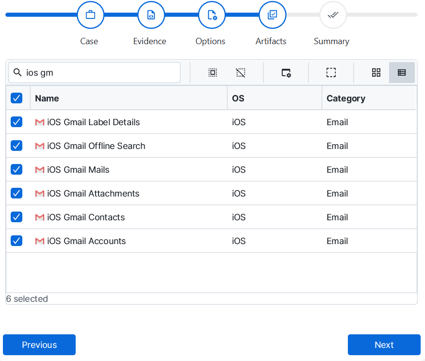 investigation, at the Artifact Selection phase, you can select iOS Gmail