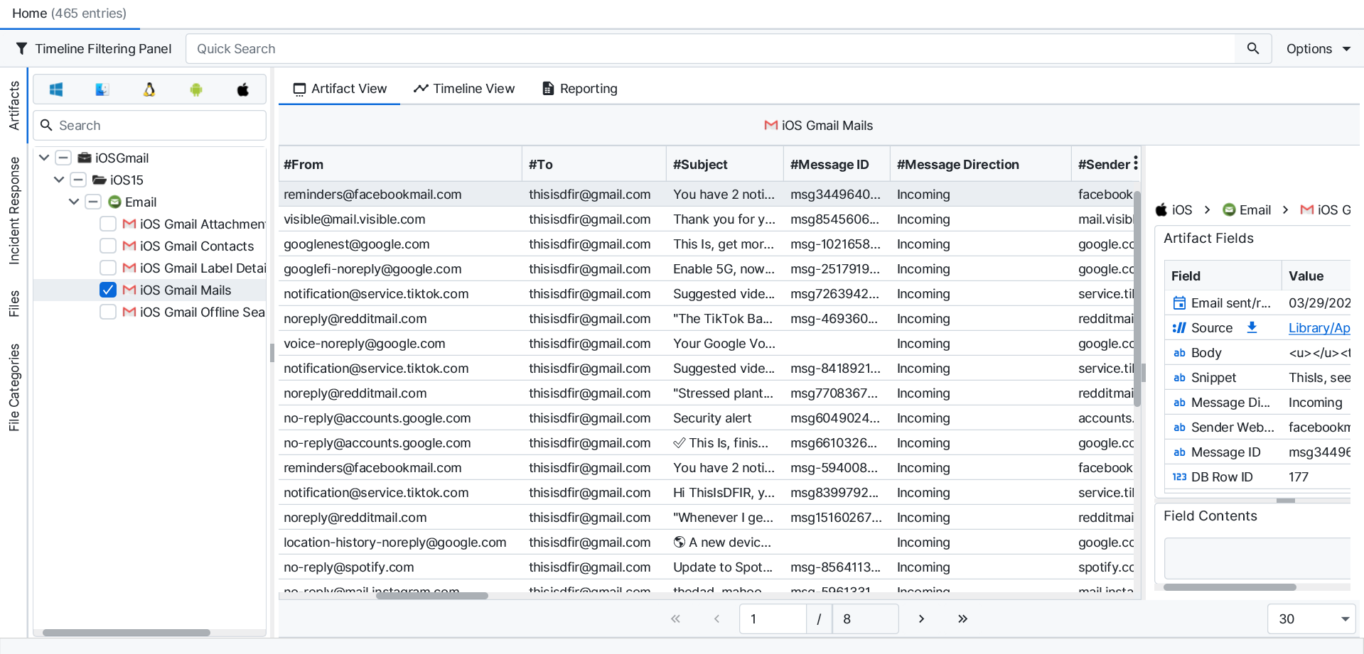 Once ArtiFast parsers plugins complete processing the artifact for analysis, it can be reviewed via “Artifact View” or “Timeline View,” with indexing, filtering, and searching capabilities. Below is a detailed description of iOS Gmail artifacts in ArtiFast.