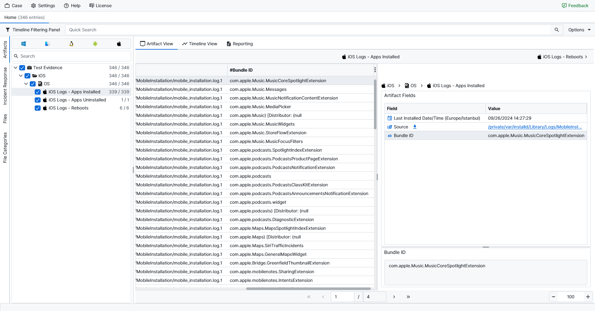 Once ArtiFast parsers plugins complete processing the artifact for analysis, it can be reviewed via “Artifact View” or “Timeline View,” with indexing, filtering, and searching capabilities. Below is a detailed description of iOS Logs artifacts in ArtiFast.