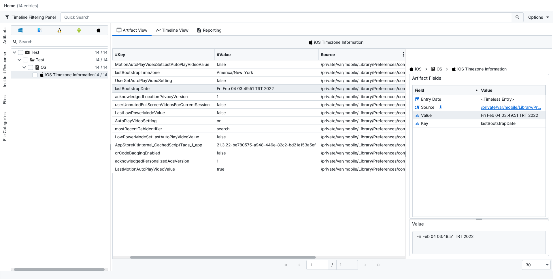 Once ArtiFast parsers plugins complete processing the artifact for analysis, it can be reviewed via “Artifact View” or “Timeline View,” with indexing, filtering, and searching capabilities. Below is a detailed description of the iOS Timezone Information Artifact in ArtiFast.