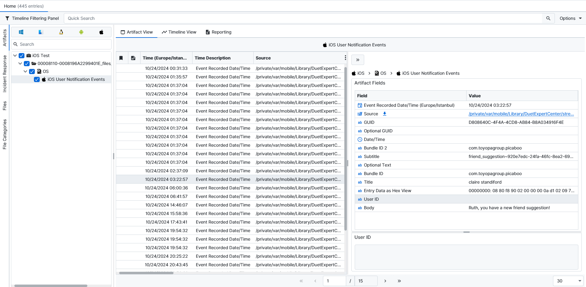 Once ArtiFast parsers plugins complete processing the artifact for analysis, it can be reviewed via “Artifact View” or “Timeline View,” with indexing, filtering, and searching capabilities. Below is a detailed description of iOS User Notification Events artifacts in ArtiFast.