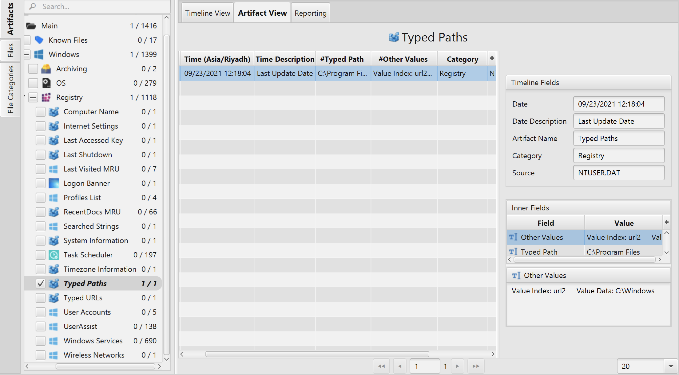 Once ArtiFast parser plugins complete processing artifacts for analysis, it can be reviewed via “Artifact View” or “Timeline View”, with indexing, filtering, and searching capabilities. Below is a detailed description of Typed Paths artifact in ArtiFast Windows.